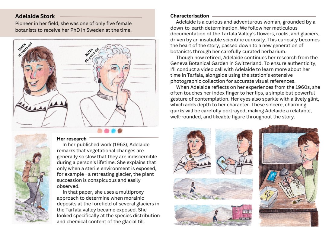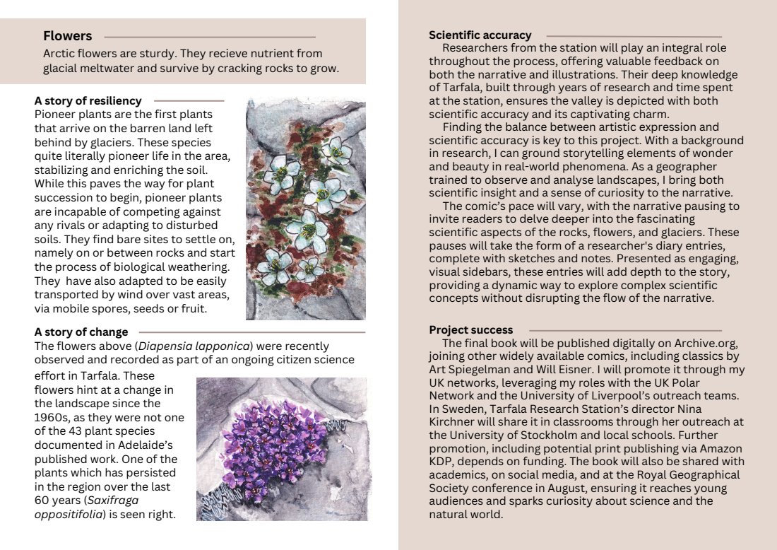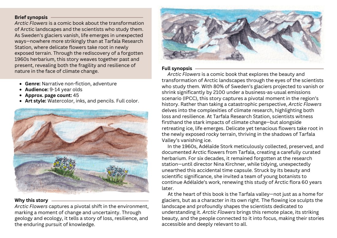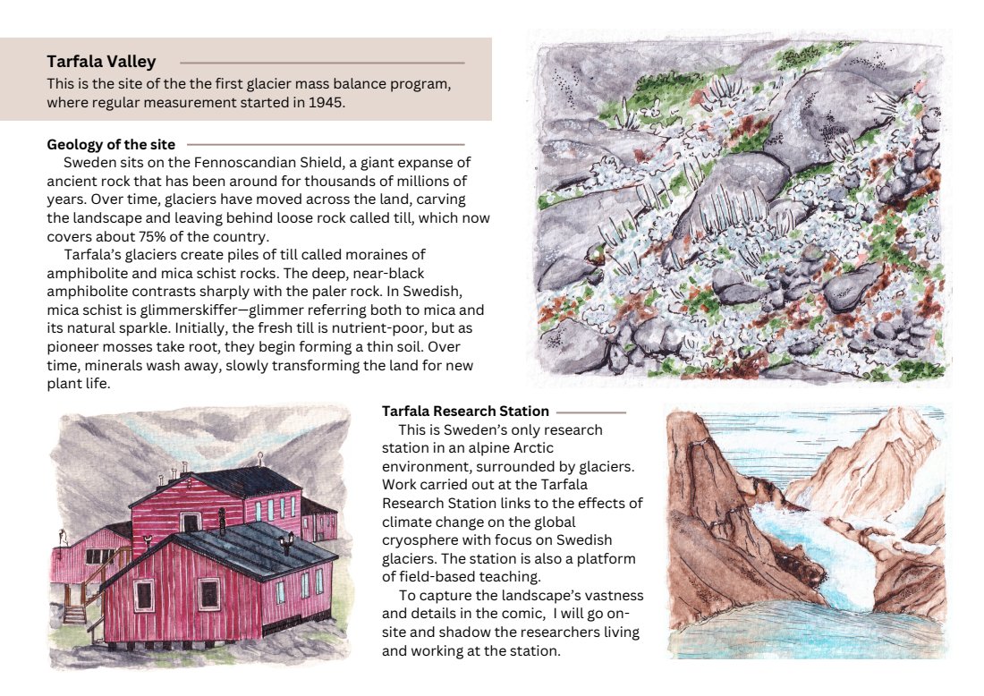 This comic explores the transformation of Arctic landscapes and the people who study them. In this story of loss and resilience, I will look at climate change through the ice, rocks, and flowers of Sweden’s Tarfala valley. The project is in progress, with the pitch deck and field pictures below.